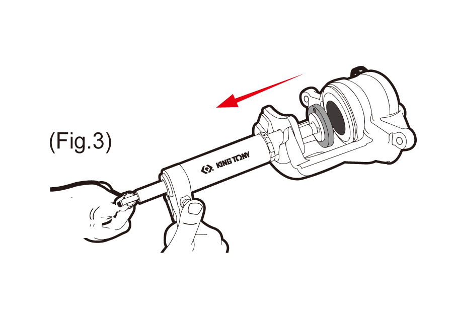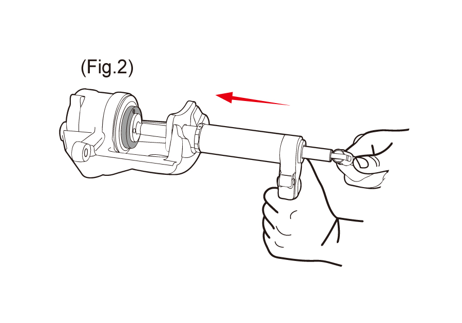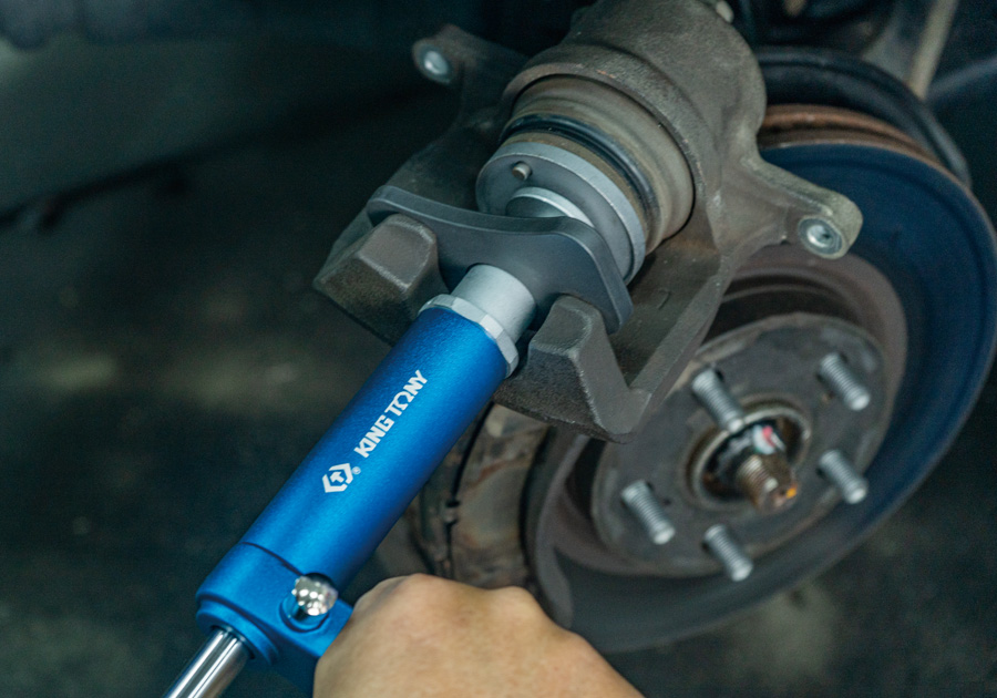 Air operated ram applies pressure to caliper piston, while the handle is rotated by hand